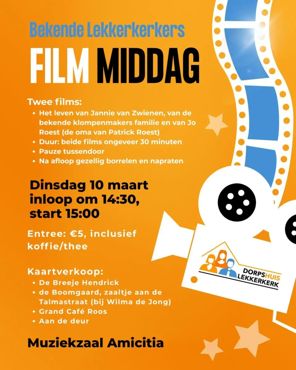 Daarnaast kun je ook kaarten kopen aan de deur. Kom samen genieten van een ontspannen filmmiddag, ontmoet dorpsgenoten en sluit af met een gezellig praatje of borrel. Iedereen is welkom!