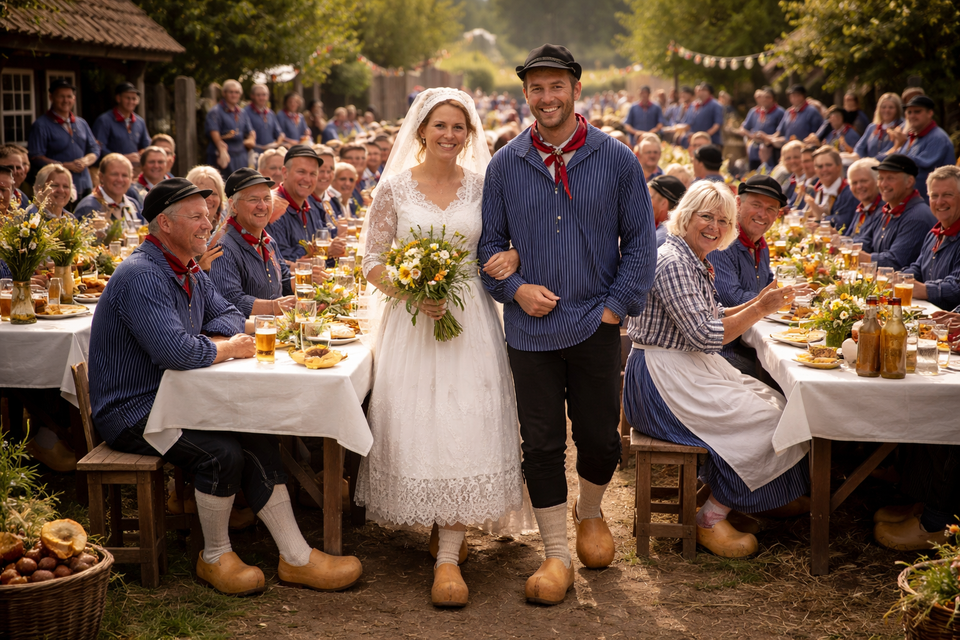 Verwacht wordt dat bruiloftsgasten in passende kleding verschijnen. “Dus gekleed zoals vroeger. Het maakt niet uit of je in het ‘zondagse’ pak komt of in een boerenkiel op klompen. De dames kunnen zich op hun paasbest uitdossen of nog met het schort om. Het gaat erom dat we met elkaar zo’n honderd jaar terug in de tijd gaan en ouderwets plezier maken.”