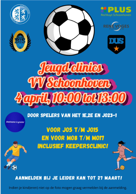 Ben je JO5 t/m JO15 of MO8 t/m MO 17? Doe dan mee aan de Jeugdclinics van VV Schoonhoven. Inclusief keepersclinic. Houd jij iedere bal tegen?