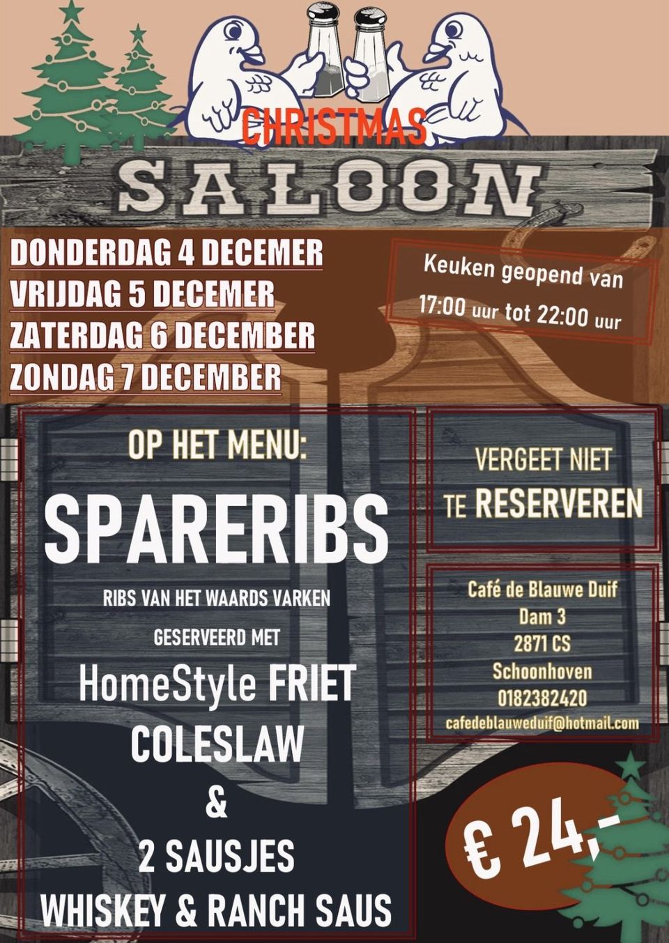 Stap binnen in de saloon van De Blauwe Duif, waar de geur van huisgemaakte spareribs van Waards varken je al tegemoetkomt. Met knapperige friet, frisse coleslaw en onze eigen whiskey ranchsaus wordt het een avond om je vingers bij af te likken.
