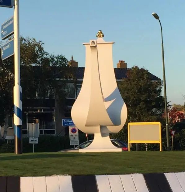 'Voor de ontwerpwedstrijd ben ik direct gaan denken. Hoe breng je het werk met goud en zilver, zoals dat in deze stad gebeurt, in beeld? Ik kwam op de koffiepot. En dan op een wijze die een vrolijke noot oplevert. Mijn oorspronkelijke idee was om drie opeenvolgende rotondes te vullen, telkens met een deel van de koffie- of theepot. De weggebruiker zou op die manier de cyclische opbouw van de koffiepot ervaren. Als gevolg van een selectie met andere inzendingen heeft men gekozen voor twee koffiepotversies, waarbij de meest complete koffiepot werd geschrapt. Zo blijft nog steeds het verhaal bestaan'.
