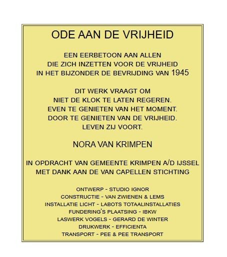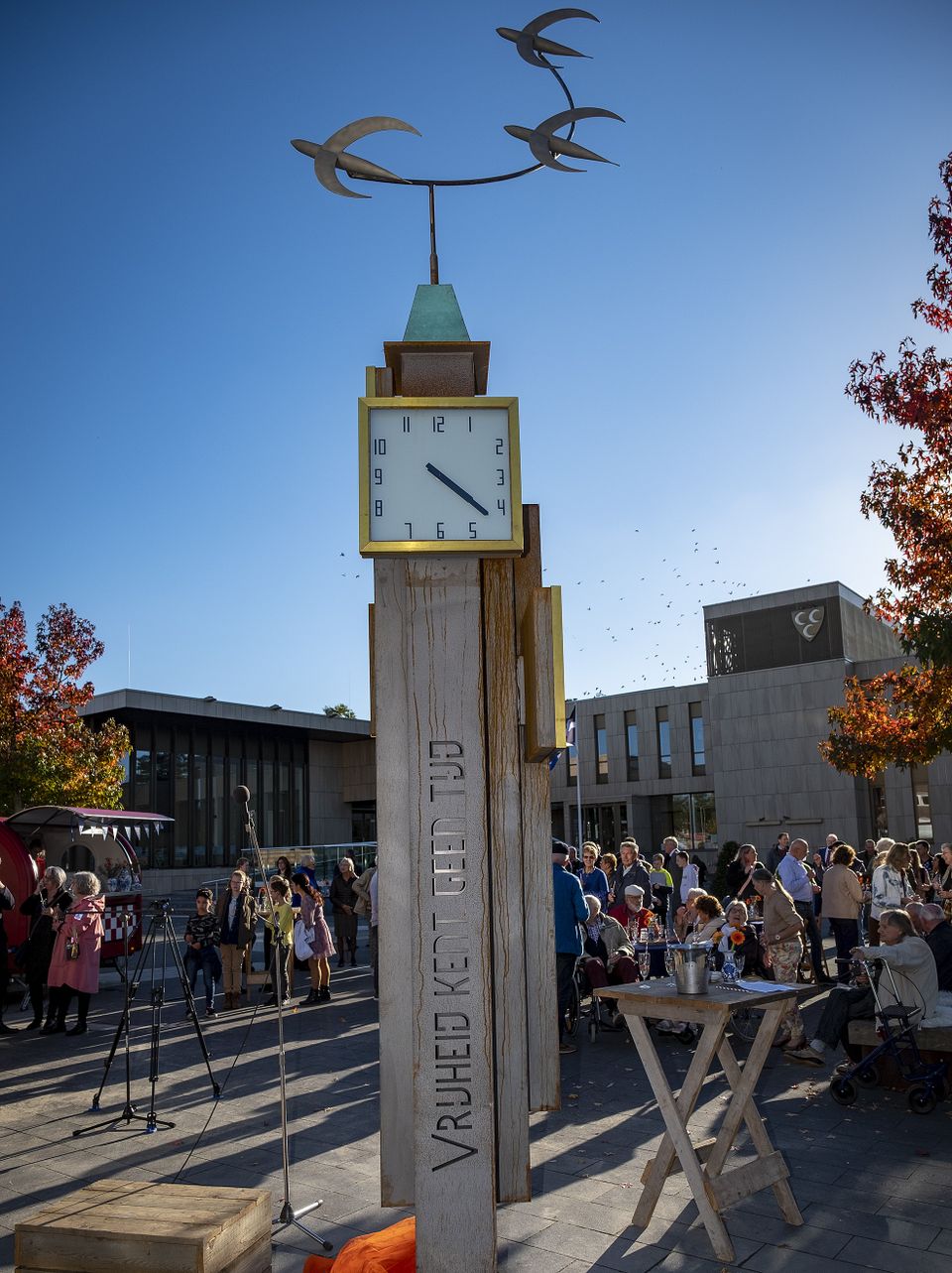 Het klokkunstwerk in het kader van 75 jaar vrijheid is onthuld op 18 oktober 2022 door toenmalig burgemeester Martijn Vroom en kunstenares Nora van Krimpen. Door corona was de onthulling twee jaar uitgesteld.