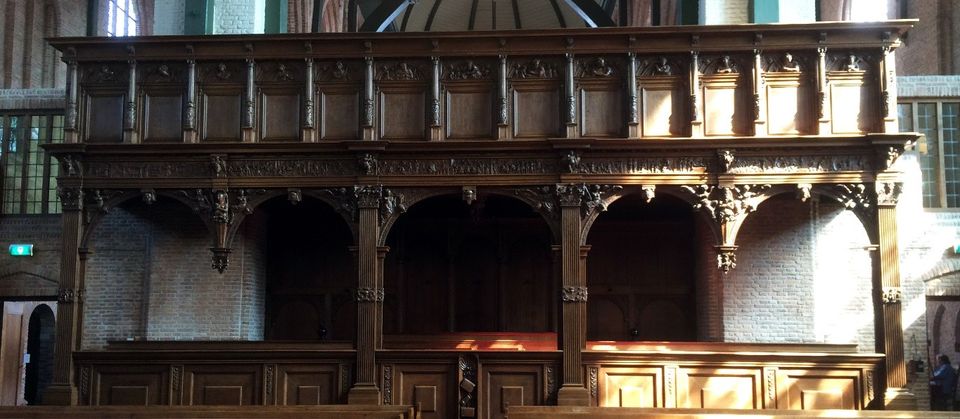 Buiten, in de noordelijke muur van het dwarsschip heeft beeldhouwer Theo van Reijn (Breda, 28 mei 1884 – Haarlem, 6 augustus 1954) vier gebeeldhouwde voorstellingen van de vier evangeliën gemaakt. Van Reijn werkte in de stijl van de Amsterdamse school.